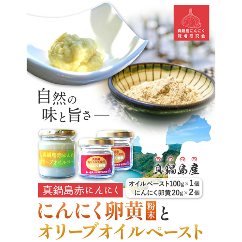 商品情報:真鍋島赤にんにくオリーブオイルペーストとにんにく卵黄(粉末)のセット