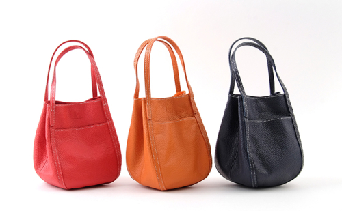 曲線が可愛いミニバック。傷が目立たない牛革を使用。旅先のホテルや街歩きのお供に大活躍。薄くたためるのでとっても便利。 市内の工場において、原材料の仕入れから、断裁、縫製、組立、梱包を一貫して行っております。
