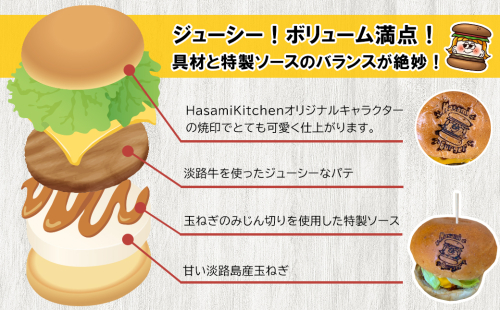 淡路牛を使ったジューシーなパテ、甘い淡路島産玉ねぎ、玉ねぎのみじん切りをたっぷり使った特製ソースのバランスが最高!バンズにはHasamiKitchenオリジナルキャラクターの焼印を一つ一つ手作業で押しているので、出来上がりがとても可愛いです。ハンバーガーを作る工程も楽しみながら、出来たての淡路島バーガーを是非ご家庭でご賞味ください。