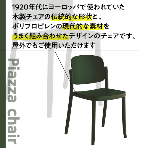 1920年代にヨーロッパで使われていた木製チェアの伝統的な形状と、ポリプロピレンの現代的な素材をうまく組み合わせたデザインのチェアです。