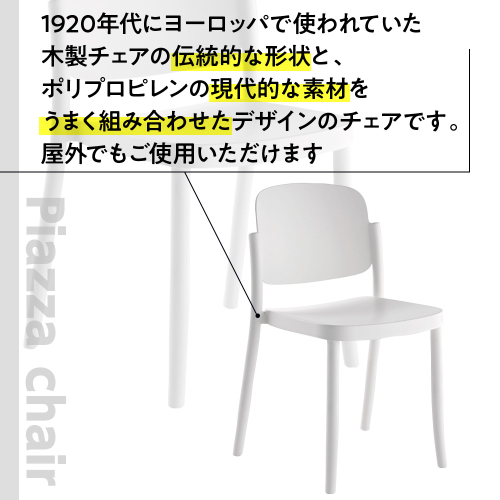 1920年代にヨーロッパで使われていた木製チェアの伝統的な形状と、ポリプロピレンの現代的な素材をうまく組み合わせたデザインのチェアです。