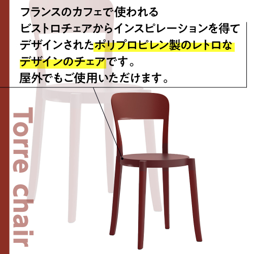 フランスのカフェで使われるビストロチェアからインスピレーションを得てデザインされたポリプロピレン製のレトロなデザインのチェアです。屋外でもご使用いただけます。