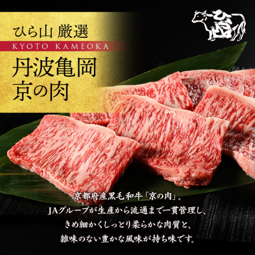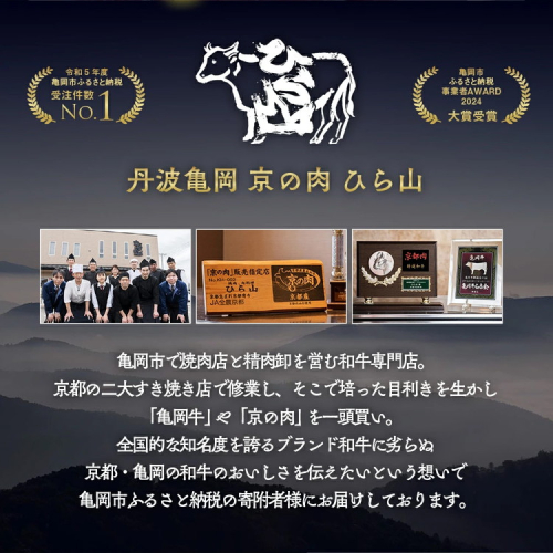 ひら山がお届けするのは、自然豊かな京都亀岡・丹波でじっくりと育て上げられたブランド黒毛和牛。「亀岡牛・京の肉・京都肉・丹波産」の中から最良のものを厳選し、ひと味違う昔ながらの風味のある、しっとりと柔らかい甘味が特徴の牛肉を当店の熟成室にて熟成させ、最大限旨味が出る最高のタイミングでお届け!
