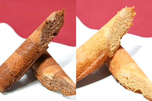 キャラメル風味のプレーンと濃厚チョコ味のスティックケーキを焦がしバターたっぷりのフィナンシェ生地で作りました。