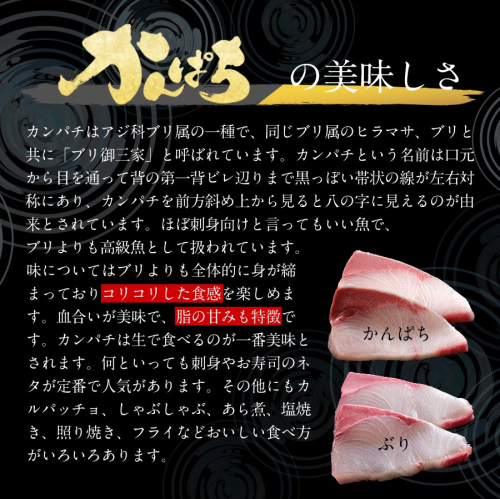 宮崎産 新海屋ブランド「宮崎ゴールドカンパチ」 鰤屋金太郎の匠が育てた極上のカンパチ! 刺身はもちろんのこと、塩焼き、しゃぶしゃぶ、ソテー、握り等数々の料理におすすめです。 ※ご希望のお日にちがある方は、ご入金後14日後以降のお日にちを備考欄へご記入下さい。 また、お申し込み後の着日変更および、配送先変更はお受けできません。 あらかじめご了承ください。 【地場産品基準】 1号:市内の事業者が市内で水揚げした魚であるため