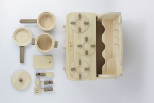 本物そっくりのキッチン。 カチカチとダイヤルを回せる3口ガスコンロにお玉やフライ返しなどの調理器具も揃っています。 京都亀岡産の檜を使って、丁寧に一つ一つ手作業で仕上げた無塗装の檜のおもちゃです。 安全認証(CE認証・STマーク)にも対応しています。 【サイズ】 W305 × H210 × D245 Weight:1,700g 【素材】 国産檜・アメリカ産ウォールナット 【製造者】 丸紅木材株式会社 大阪市中央区南船場1-18-17 商工中金船場ビル13階 【地場産品に該当する理由】 原材料の主要な部分が亀岡市内で生産されたもの(平成31年総務省 告示第179号第5条第2号に該当)