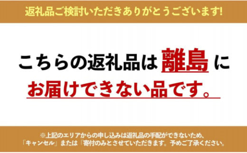 ※上記のエリアからの申し込みは返礼品の手配が出来ないため、「キャンセル」または「寄附のみ」とさせていただきます。予めご了承ください。