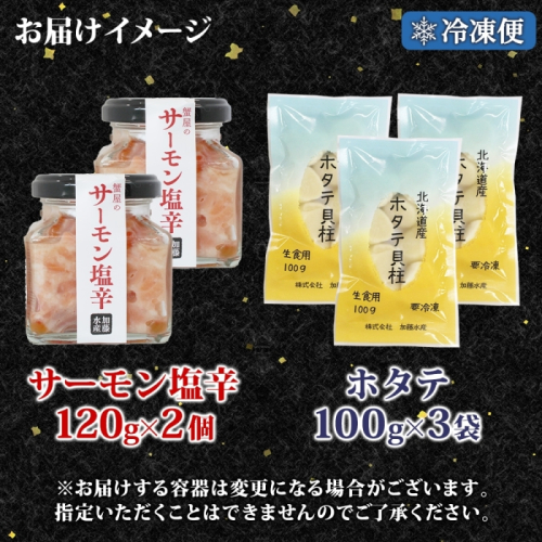 - 3435. サーモン塩辛 120g 2個 ホタテ 100g 3パック 小分け サーモン 鮭 さけ サケ いくら ほたて 貝 魚介 海鮮 ご飯のお供 冷凍 数量限定 送料無料 ギフト 北海道 弟子屈町