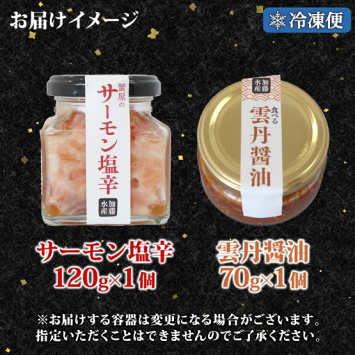 - 3118. 食べる雲丹醤油 70g サーモン塩辛 120g セット 数量限定 雲丹 うに ウニ サーモン 塩辛 鮭 さけ サケ いくら おつまみ ご飯のお供 ごはんのおとも ピリ辛 漬け アレンジ 海鮮 瓶詰 冷凍 数量限定 送料無料 瓶 ギフト 贈り物 プレゼント 北海道 弟子屈町