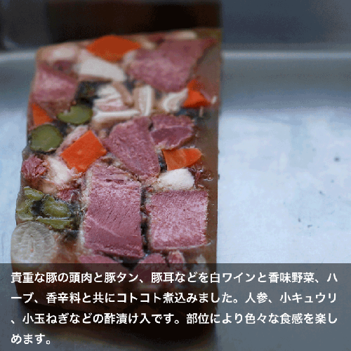 「レモンと鶏肉ハーブのプレッセとピクルスの入った豚頭肉のゼリー寄せ」&「あると便利なハムとベーコン」のギフトセットです。