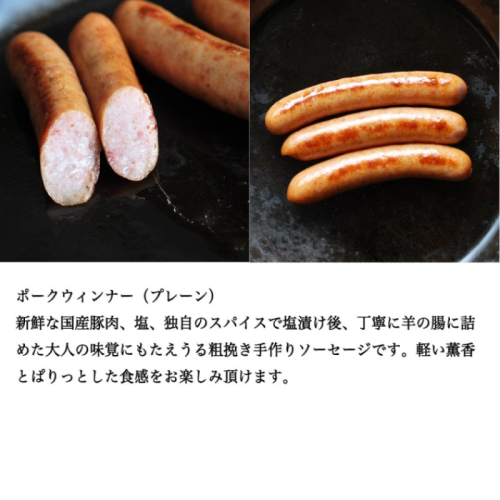 ポークウィンナー(プレーン):新鮮な国産豚肉、塩、独自のスパイスで塩漬け後、丁寧に羊の腸に詰めた大人の味覚にもたえうる粗挽き手作りソーセージです。軽い薫香とぱりっとした食感をお楽しみ頂けます。