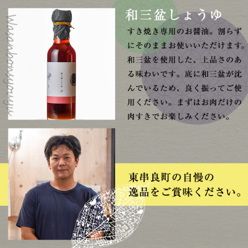 最高のすき焼きのために開発されたすき焼き専用”和三盆醤油”。使用する調味料にもこだわり、甘味料、保存料は不使用。まろやかな甘味と旨みが特徴の醤油です。”これ1本あれば最高のすき焼きを楽しめる事間違いなし。まずは贅沢にお肉を。後からはお野菜も合わせて。