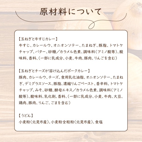 栄養たっぷりの極上玉ねぎをベースに、ちょっぴり贅沢な「玉ねぎと牛すじのカレー」、上品な味わいの「玉ねぎとチーズが溶け込んだポークカレー」の2種類と、全粒粉を加え魅力ある食感が楽しめる「麦まるごとうどん」3袋のセットです。