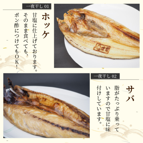 - 開きホッケ1枚、開きサバ1枚、干しナメタ1枚、開きサクラマス1枚