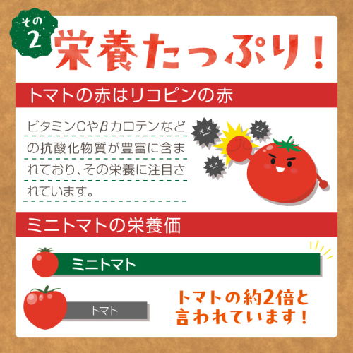 一方、ミニトマトに含まれる栄養素も豊富で、リコピンやカロチンなど、積極的に食べたい野菜の一つ!