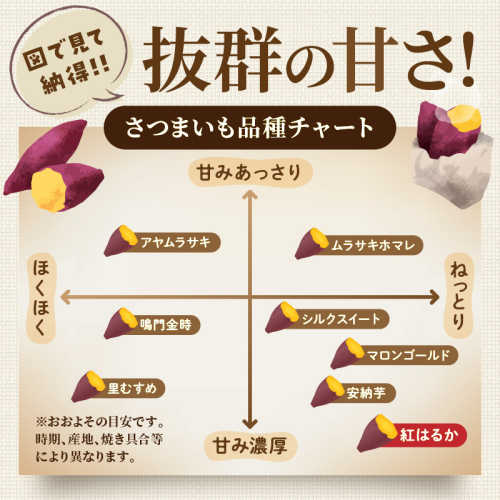 べにはるかは糖度が高く、ねっとりとした食感が特徴です。オススメの食べ方は、大学芋や焼き芋がおすすめです!