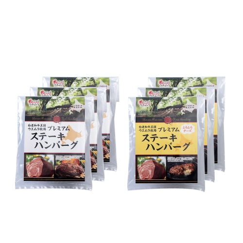 《ヒルナンデスで紹介されました!》 生産から加工・製造まで行い、ウエムラ牧場の選りすぐりの牛肉を使った「プレミアムハンバーグ」。白老牛本来の旨さをしっかりと伝えることを目的に徹底的にこだわって作り上げた贅沢なハンバーグです。このプレミアムハンバーグに長期熟成タイプのチーズを使用したのが「とろとろチーズ入ハンバーグ」。肉の旨みに負けない相性抜群のチーズを絡めることで、さらにハンバーグの美味しさが際立ちます。