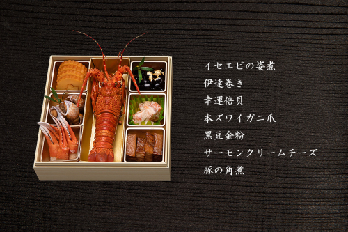 一段目 イセエビの姿煮/伊達巻き/幸運倍貝/本ズワイガニ爪/黒豆金粉/サーモンクリームチーズ/豚の角煮