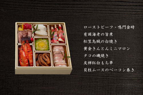 二段目 ローストビーフ・鳴門金時/有頭海老の旨煮/松笠烏賊の白焼き/黄金きんとんミニマロン/タコの磯焼き/友禅紅白もち串/貝柱ムースのベーコン巻き