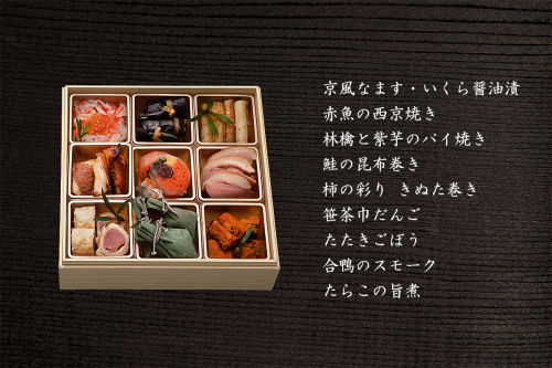 三段目 京風なます・いくら醤油漬/赤魚の西京焼き/林檎と紫芋のパイ焼き/鮭の昆布巻き/柿の彩り きぬた巻き/笹茶巾だんご/たたきごぼう/合鴨のスモーク/たらこの旨煮