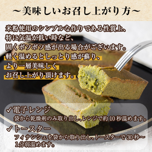 鹿児島県霧島産オーガニック抹茶と黒糖、バター、それぞれがしっかり味わえる米粉100%のフィナンシェ。
