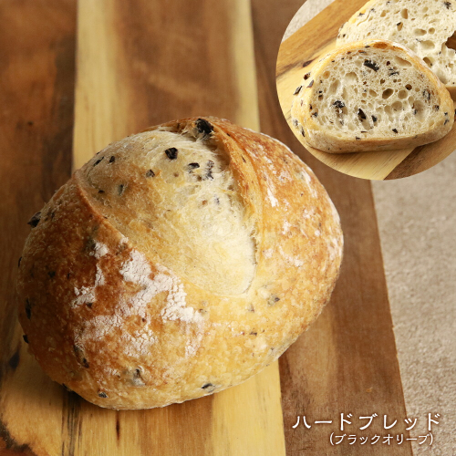 バケット生地にブラックオリーブをくだいて混ぜ合わせて焼き上げました。