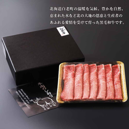 「白老牛」は北海道白老町の温暖な気候、豊かな自然、恵まれた水など北の大地の恩恵と生産者のあふれる愛情を受けて育った黒毛和牛です。  ”北海道洞爺湖サミット”では、日米首脳晩餐会、総理大臣夫人主催昼食会に使用され、世界のVIPからも絶賛されました。深いコクとまろやかな味わいは絶品です。是非「白老牛」をご賞味ください。 白老牛の中でも赤身のうま味が強く、きめ細かな肉質と和牛本来のおいしさを味わえる肩肉をすき焼き用にスライス。霜降りと赤身の旨みとコク、上品でまろやかな味わいをご堪能ください。 ◆お礼の品・配送に関するお問い合わせ◆ 株式会社スプレス 白老町コールセンター(TEL:011-807-0176 平日9:00~17:30)