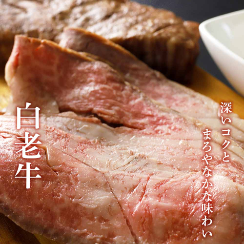 ”北海道洞爺湖サミット”では、日米首脳晩餐会、総理大臣夫人主催昼食会に使用され、世界のVIPからも絶賛されました。深いコクとまろやなかな味わいは絶品です。是非「白老牛」をご賞味ください。白老牛の通常ステーキに使用するサーロインを贅沢にローストビーフに仕上げました。霜降りのとろける舌触りと肉の旨みを味わっていただける様、塩と香辛料のみでじっくりと仕上げた一品です。白老牛の贅沢な旨みを北海道産の山わさびと一緒にご賞味ください。