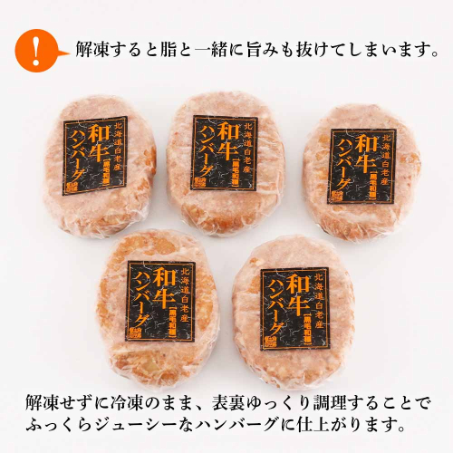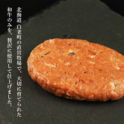 原料肉は北海道白老で大切に育てられた和牛のみを贅沢に使用して仕上げました。赤身と脂身のバランスを一定にジューシーながらコクと旨みを引き出した和牛ハンバーグです。冷凍から焼き上げることでふっくら仕上がります。また、当ハンバーグは和牛の味を楽しむハンバーグですのでソースは付けておりません。そのままでも十分美味しいですが調理時に残った肉汁にお好みで醤油やポン酢、ケチャップ、大根おろし等でオリジナルソースを作るとさらに美味しくお召し上がれます。野菜炒め等に使用しても和牛肉の旨みと融合して美味しくお召し上がりいただけます。