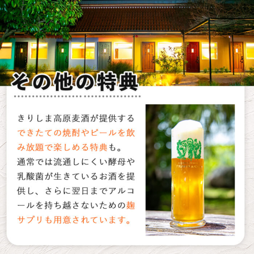 【麹・発酵ホテルGEN】では、きりしま高原麦酒が提供するできたての焼酎やビールを飲み放題で楽しめる特典も。通常では流通しにくい酵母や乳酸菌が生きているお酒を提供し、さらに翌日までアルコールを持ち越さないための麹サプリも用意されています。
