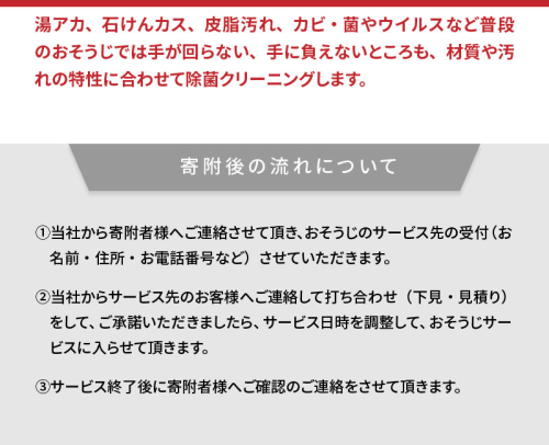 (1)当社から寄附者様へご連絡させて頂き、おそうじのサービス先の受付(お名前・住所・お電話番号など)させていただきます。