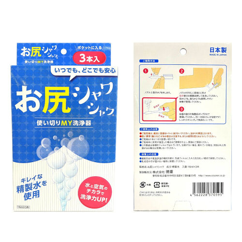 いつでもどこでも使用できる使い切りのお尻洗浄器。一つひとつ個包装で衛生的、シャワー式トイレの無い旅行先やアウトドア、災害時の備えとしても最適です。 ・使い切りタイプのお尻洗浄器です。 ・キレイな精製水入り ・空気と水をミキシングして水玉噴射、少ない水でも十分な洗浄力。 ・外出先で備え付けの洗浄器を使用するのに抵抗がある方や、シャワー式トイレがない旅行先やアウトドア、水や電気が使用出来ない災害時にも活躍します。ご家庭の防災備蓄品としても最適です。 【提供事業者】株式会社徳重 TEL:0133-68-6677