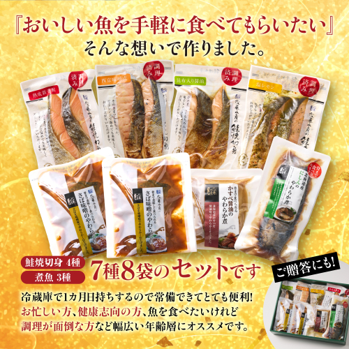 そのまま食べられる鮭の切身と煮魚の詰合せです。調理済みなので食べたいときに簡単食べられる便利な商品です。