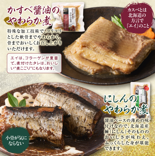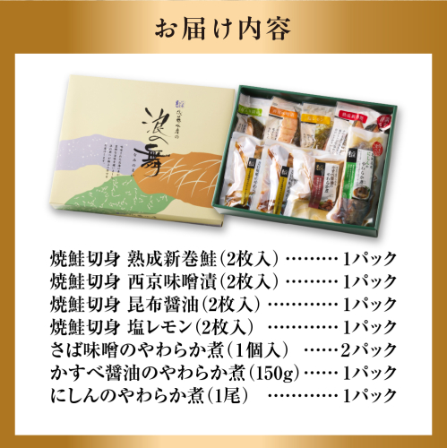- 焼鮭切身熟成新巻鮭、焼鮭切身昆布醤油、焼鮭切身塩レモン、焼鮭切身西京味噌漬 各2枚入各1P、さば味噌やわらか煮1個入×2P、かすべ醤油のやわらか煮150g×1P、にしんのやわらか煮1尾×1P