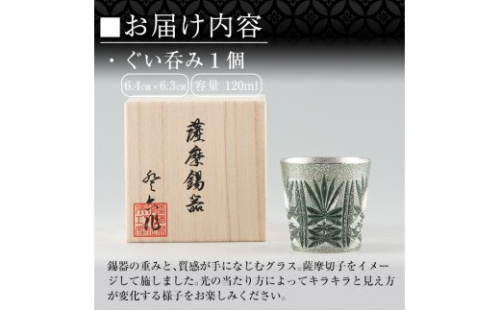 《100年以上の老舗店・薩摩錫器工芸館》 【大人気】薩摩錫器工芸館の薩摩錫器の新商品がお礼の品に追加されました。  薩摩錫器の商品に切子柄を彫り込み、表面の色は緑色の漆で表現しました。  日本酒・焼酎・ウイスキーのショットグラスとしてお楽しみください。 【薩摩錫器とは】  鹿児島県霧島市を代表する伝統工芸品で、鹿児島県伝統的工芸品にも指定されています。  300年の歴史を持つ薩摩藩ゆかりの錫細工です。  錫器は使うほどに味わいが出て手にするとずっしりと重みと温かさがあります。  また、イオン効果があり、焼酎の味がまろやかになるといわれています。 【薩摩錫器工芸館の薩摩錫器】 ★令和元年かごしまの新特産品コンクールで、鹿児島県貿易協会会長賞を受賞しました★   薩摩錫器工芸館 株式会社   0995-45-0177   https://www.satsumasuzuki.co.jp/ 《地産理由》市内で製造・加工された工芸品
