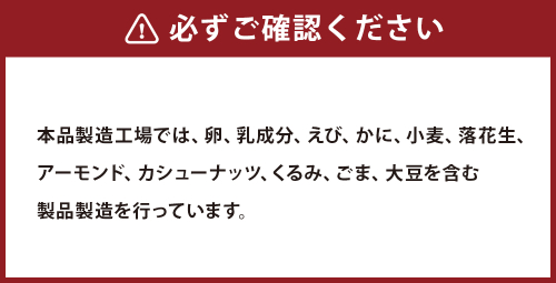 ※本品製造工場では、卵、乳成分、えび、かに、小麦、落花生、アーモンド、カシューナッツ、くるみ、ごま、大豆を含む製品製造を行っています。