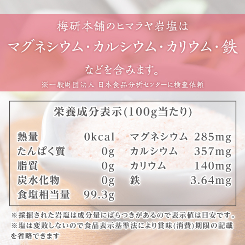 キレイなピンク色は、鉄分を含む証。岩塩に含まれるカルシウム・カリウム・鉄分などの成分によって、まろやかな味わいで素材の旨味を引き立てる特徴があります。いざという時に非常食・保存食を食べても『味に何かが物足りない』と思う時がくるかもしれません。そんな時に生命維持に必要な成分を含み、素材の旨味を引き立てるヒマラヤ岩塩を備蓄しておくことで一安心。