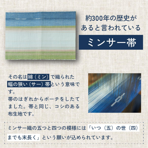 ミンサー帯の由来は、綿(ミン)で織られた幅の狭い(サー)帯。約300年の歴史があるといいます。16メートルの糸から2本の帯を織り、そのはぎれから小銭入れを仕立てました。帯と同じ、コシのある布地です。