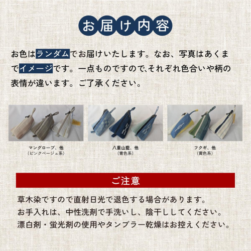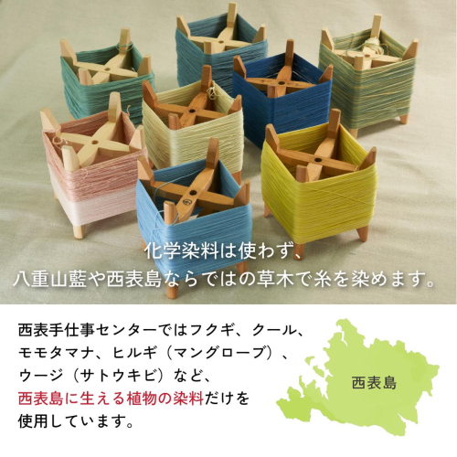 色味は西表手仕事センターにお任せください。藍(青色系)、フクギ(黄色系)、ヒルギとクール(ピンクベージュ系)の3種の中から1点、お届けします。
