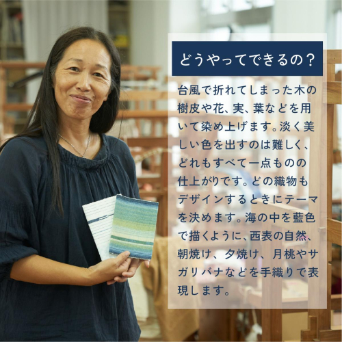 染織家の川満さん、かつては着付師として活躍していました。「小物からミンサー織を知っていただき、いつかミンサー帯を身につけてもらうきっかけになれたら」といいます。西表手仕事センターの染織物を手に取って、島の景色を思い浮かべてみてください。
