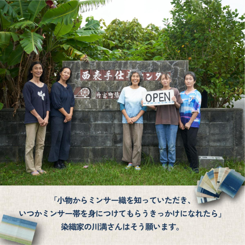 ミンサー帯の由来は、綿(ミン)で織られた幅の狭い(サー)帯。約300年の歴史があるといいます。16メートルの糸から2本の帯を織り、そのはぎれから小銭入れを仕立てました。帯と同じ、コシのある布地です。 色味は西表手仕事センターにお任せください。藍(青色系)、フクギ(黄色系)、ヒルギとクール(ピンクベージュ系)の3種の中から1点、お届けします。 八重山藍や西表島ならではの草木で糸を染めます、化学染料は使いません。 西表手仕事センターではフクギ、クール、モモタマナ、ヒルギ(マングローブ)、ウージ(サトウキビ)など、西表島に生える植物の染料だけを使用しています。 台風で折れてしまった木の樹皮や、花、実、葉などを用い染め上げる。淡く美しい色を出すのが難しく、奥深い。同じ色味はなくすべて一点ものなのです。 どの織物も、デザインするときにテーマを決めます。海の中を藍色で描くように、西表の自然、朝焼け、夕焼け、月桃やサガリバナなどを手織りで表現します。 染織家の川満さん、かつては着付師として活躍していました。「小物からミンサー織を知っていただき、いつかミンサー帯を身につけてもらうきっかけになれたら」といいます。西表手仕事センターの染織物を手に取って、島の景色を思い浮かべてみてください。