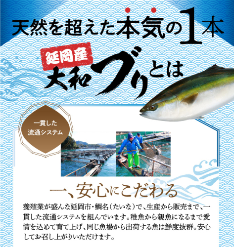 自社捕獲の稚魚から大事に育てた特選の「大和ブリ」。 しっかりとした肉厚に弾力のある食感が特徴です。 ブリ独特の臭みや変色が非常に少なく、脂ののりも十分に、ブリ本来の旨みが際立つ自信の一品となっております。 お刺身用に皮を外しブロックにしています。 お刺身はもちろん、薄くスライスしてしゃぶしゃぶに、焼きもの、煮物でも美味しくお召し上がっていただけます。 ぜひご賞味ください! 【地場産品基準】 1号:市内の事業者が市内で水揚げしたブリであるため