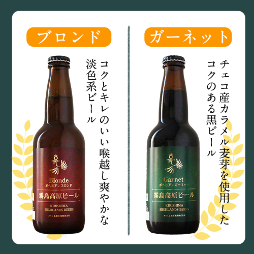 A3-006-A 《通常便》国産!霧島高原ビール2種飲み比べセット ブロンド・ガーネット各330ml(各種3本・計6本)【河内菌本舗】霧島市 地ビール ビール 麦酒 お酒 酒 瓶 通常便 191513 - 鹿児島県霧島市