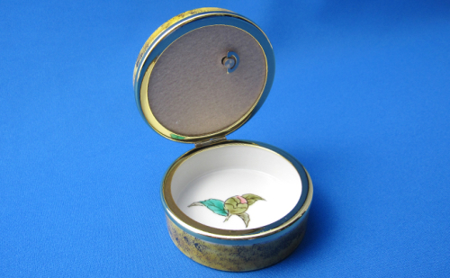 赤を使わず「青(緑)、黄、紫、紺青」を使用した青手古九谷の塗り埋め様式を踏襲しており江戸時代吉田屋窯で作られていたことから吉田屋風と呼ばれています。更にピンクをしゃくやくで描き現代風な吉田屋の技法を使った九谷焼オルゴールです。