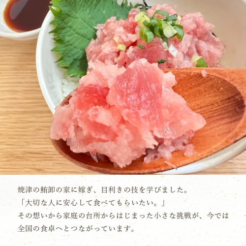 【説明】天然鮪のみを使用。油脂・ショートニングは不使用、酸化防止剤も最小限に抑え、まぐろ本来の旨みを大切に仕上げました。焼津の鮪卸の家に嫁ぎ、目利きの技を学んだ私が「大切な人に安心して食べてもらいたい」という想いでつくったネギトロです。解凍して混ぜるだけで、とろける食感と濃厚な旨みがふわりと広がり、食卓にちょっとした贅沢を添えてくれます。