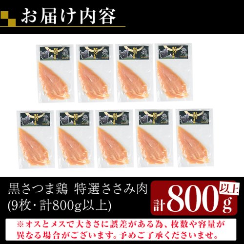 K-421 鹿児島県産黒さつま鶏 特選ささみ肉(9枚・計800g以上)【ビッグバード・カピリナ】霧島市 国産 鶏肉 鳥肉 ササミ肉 鶏ささみ 肉 とりにく タンパク質