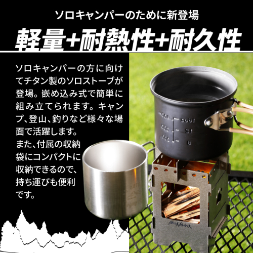 そんなソロキャンパーの方に向けて軽量で耐熱性、耐久性に優れたチタン製のソロストーブが登場。 嵌め込み式で道具なしで簡単に組み立てられます。 キャンプ、登山、釣りなど様々な場面で活躍します。 また、付属の収納袋にコンパクトに収納できるので、持ち運びも便利です。