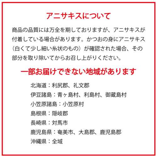 かつおの身にアニサキス(白くて少し細い糸状のもの)が確認された場合、その部分を取り除いてからお召し上がりください。
