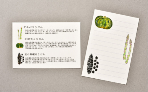 遠軽町生田原産のアスパラ・かぼちゃを練り込んだ「アスパラうどん」・「かぼちゃうどん」と、黒千国豆を練り込み白滝の黒曜石をイメージした黒い麺の「豆の黒曜石うどん」を木箱に詰合せています。