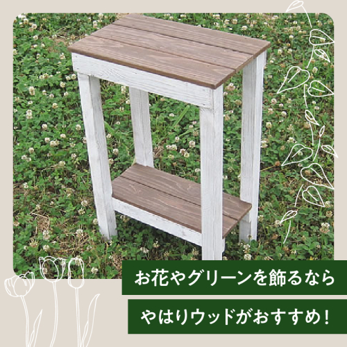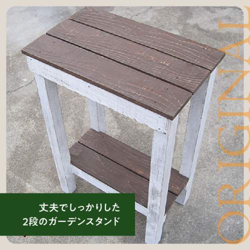 ユーズド感のあるアンティークなエイジング調仕上げで、天然木から一つ一つ丁寧に手作業で制作した2段のガーデンスタンドです。
